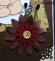 I coloured it with promarkers, I wanted to try out my new glasses as soon as I got them home! I'm pleased to say they're brilliant, I can see what I'm colouring! All the backing papers are from my scraps drawer. The base card is a sort of goldie coloured pearlescent card. I've used a Martha Stewart corner punch to add some interest to the brown panel and added some green and some black gems with my heat setter. The ribbon is from my stash and must have come from some packaging at some point. I've made a flower using a large paper flower, which used to be light green before I promarkered it, and a red fabric flower, topped with a button. I've added some green beads to two black topped pins instead of adding leaves. The butterfly is cut from a neutral sheet of vellum. Here's a few more piccies...